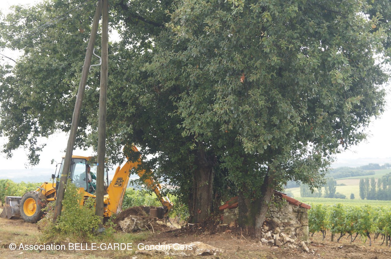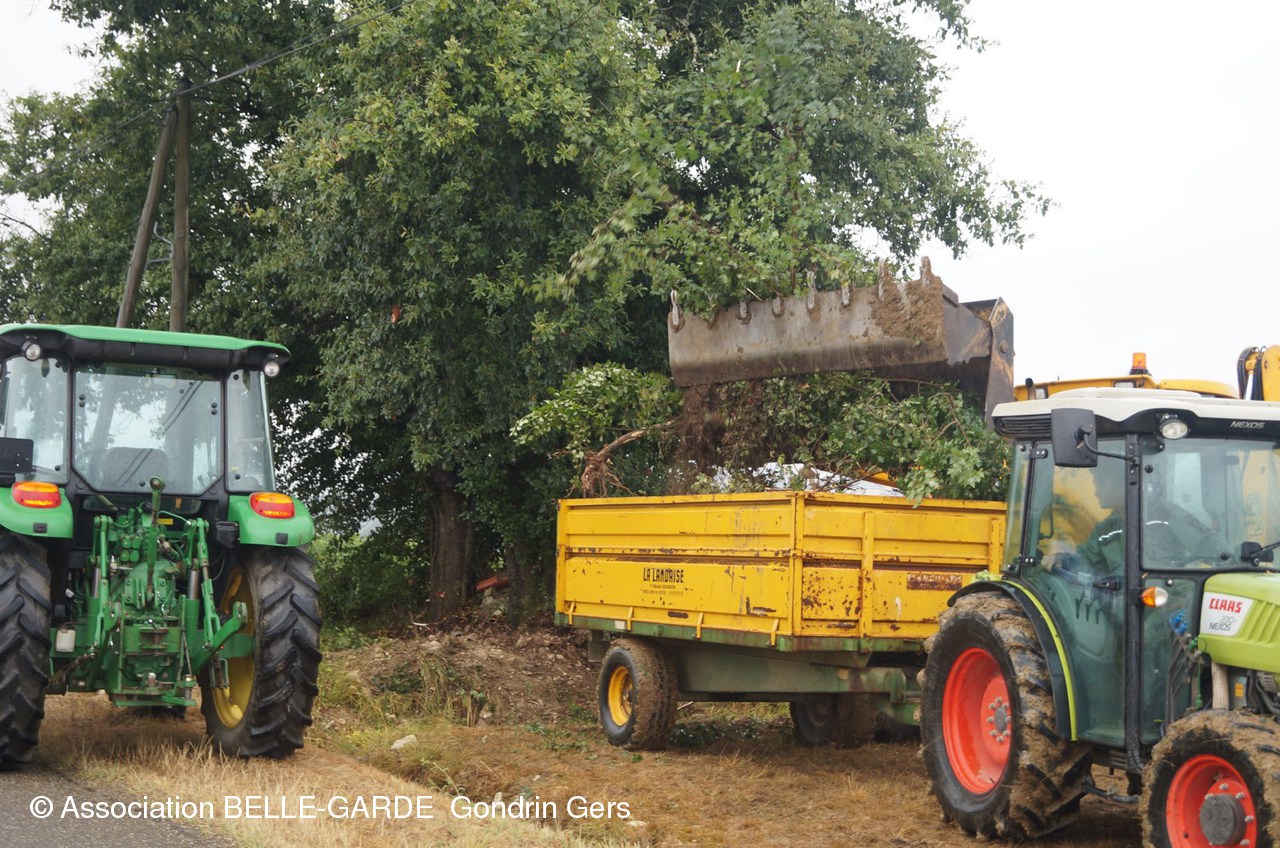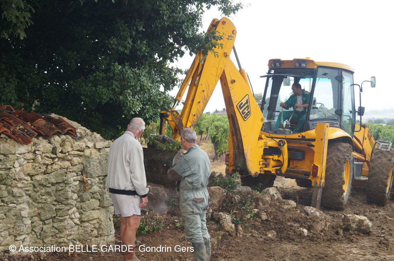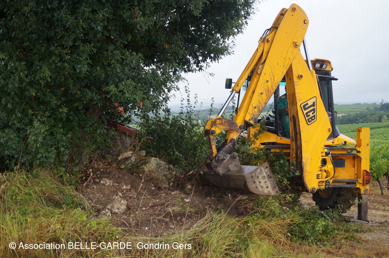 Sous une forte pluie le tracto-pelle de Joël Bordeneuve a procédé à l'enlèvement des tonnes de pierres entassées aux alentours, au fil des ans.